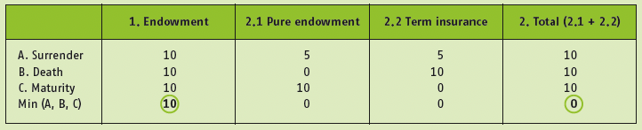 • Subadditivity not always guaranteed: similar to Solvency II, classifying products into homogeneous groups might result in different results for an identical underlying risk profile. Consider the example of the Non-Distinct Investment Component (NDIC) for an endowment product. Economically, the product consists of a pure endowment plus a term assurance product for a single policyholder. The NDIC is the amount that has to be paid to the policyholder under different circumstances or insurance events.