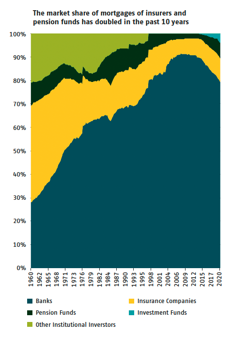 For more than 50 years, banks had an ever increasing share in the Dutch mortgage market. However, this trend has shifted in favor of insurers (growth of 50% in past decade), pension funds (growth of 200% in past decade) and investment funds. See Figure 1.