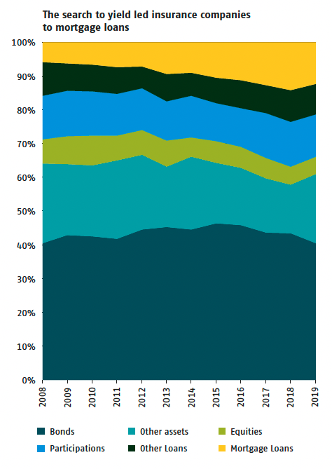 1. The low and flat yield curve; Long-term interest rates have fallen sharply in de past years. Because insurers and pension funds naturally have long-term obligations, it is more attractive for them than for banks to offer competitive mortgage interest rates. The search for yield has resulted in a doubling of the share of mortgages on the balance sheet of insurance companies. See Figure 2.