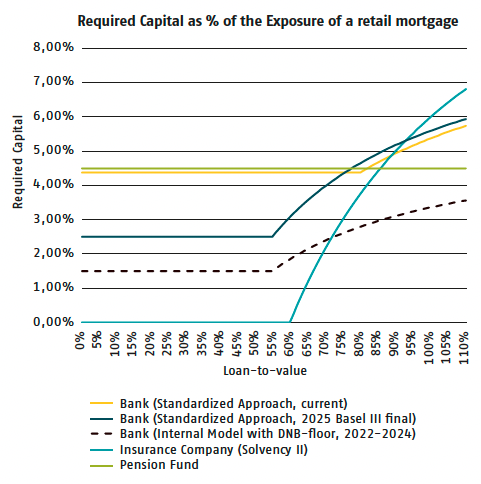 We compared the Basel III capital requirement (banks) with the standalone capital requirement for mortgage loans under Solvency II (insurance companies):