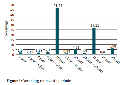 De meeste hypotheken hebben een rentevaste periode van 10 jaar (47.3%) en daarna een rentevaste periode van 20 jaar. Slechts 4.5% heeft een rentevaste periode kleiner dan of gelijk aan 5 jaar.