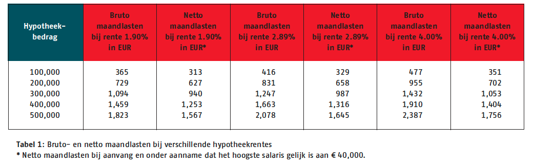 Daarnaast is het interessant om ook te kijken naar de impact van een verdere rentestijging met als scenario een hypotheekrente van 4.0%. De bruto maandlasten stijgen dan met circa 31% ten opzichte van de rente van 1.90% en de netto maandlasten met circa 12%. Hierbij moet worden opgemerkt dat dit de netto maandlasten bij aanvang zijn van de hypotheek en dat gedurende de looptijd van de hypotheek de netto maandlasten naar de bruto maandlasten toegaan.
