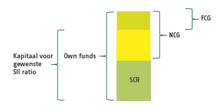 De Solvency II richtlijnen definiëren de hierboven weergegeven elementen als bouwstenen voor de verplichtingen (of liabilities) zijde van een balans. Hierbij legt NCG de focus op de verandering in de bouwsteen rechtsboven: het vrije vermogen (of excess assets). De NCG geeft dus eigenlijk weer welke kasstromen beschikbaar komen als vrij vermogen. De NCG is afhankelijk van de volgende drie componenten: