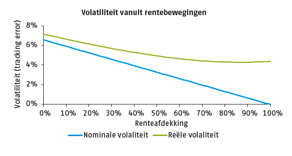 Deze twee doelstellingen zijn (deels) tegenstrijdig met elkaar. Een constante nominale uitkering kan niet met inflatie meebewegen. Voor het behalen van een constante uitkering is simpelweg een hoge renteafdekking gewenst, bij voorkeur 100%. Hierdoor zijn uitkeringen niet meer afhankelijk van de rente en resteert alleen de volatiliteit als gevolg van zakelijke waarden en ontwikkelingen in levens- verwachtingen. Dit is ook duidelijk te zien in figuur 1, waarbij de volatiliteit van de pensioenuitkering als gevolg van rentebewegingen lineair afneemt bij een hogere mate van renteafdekking. Vanuit een reëel perspectief gezien is het beeld minder eenduidig. De nominale rente die we afdekken bestaat uit de reële rente en inflatie- verwachtingen. Vanuit koopkracht gezien willen we geen negatief rendement op de renteafdekking wanneer de inflatie stijgt. De gewenste nominale afdekking vanuit een reëel perspectief is daarom afhankelijk van het relatieve belang van de reële rente en verwachte inflatie. Als we in figuur 1 naar de volatiliteit kijken van de reële uitkering dan zien we dat deze het laagste zou zijn geweest bij circa 85% - 90% renteafdekking. Tegelijk zien we dat het verschil met een volledige afdekking beperkt is. Wanneer beide doelstellingen van belang zijn lijkt een nominale renteafdekking van circa 100% daarmee gewenst. Een reële afdekking (met bijvoorbeeld inflatiegerelateerde obligaties) zou natuurlijk het reële risico nog verder kunnen verlagen.