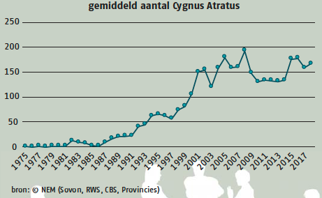 De Cygnus Atratus (zwarte zwaan) is een prachtige zwarte (zwem)vogel met een roze-rode snavel en grijze poten. De soort vindt zijn oorsprong in Australië en was tot eind 17de eeuw niet bekend in Europa. Inmiddels is het een populaire siervogel die in diverse Europese landen wordt gehouden en gefokt en zijn er verwilderde populaties ontstaan door ontsnapping dan wel vrijlating. Sinds 1978 broedt deze soort ook in Nederland. Het aantal zwarte zwanen is echter nog steeds gering, dus je behoort tot de ‘happy few’ als je een exemplaar ‘in het wild’ hebt mogen spotten. De grootte van de populatie is enigszins volatiel en de populatie is nog te gering om een duidelijke groeitrend te kunnen ontdekken. De ‘dip’ tussen 2005 en 2015 komt mogelijk doordat de zwarte zwanen niet zo goed gedijen in kou (het lijkt of na echt koude winters de populatie afneemt), maar ook dat is niet zeker.